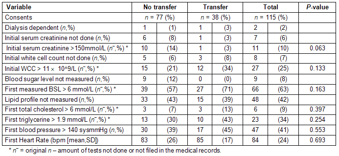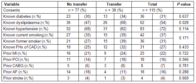 Histories of cardiovascular diseases, high blood pressure, diabetes and smoking were not significant, nor was family history for coronary artery disease. Known history of dyslipaedemia was different between transfer groups (p-value was 0.028).