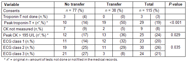 A positive peak troponin-T was measured in 19 (50%) transferred and 10 (14%) non-transferred patients. Of the transferred patients, 13 (36%) had high peak creatine kinase (CK) levels compared with 12 (17%) non-transferred patients. The ECGs of 12 (32%) transferred and 11 (14%) non-transferred patients were suspected for STEMI. All three determinants were significant in chi-squared tests.