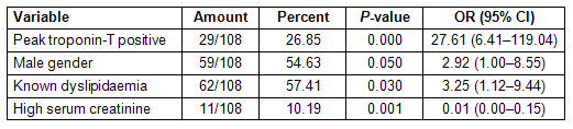 Gender and serum creatinine, which were not significant predictors on their own, became significant when taken into account with troponin-T and known dyslipidaemia. All four factors had significant increased or decreased odds when adjusted for each other (Table 7).