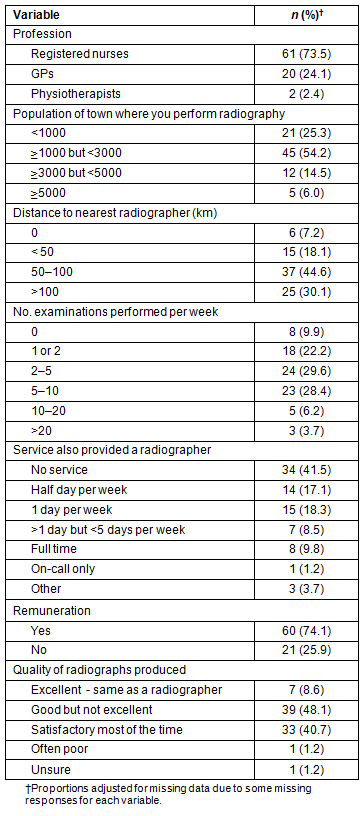 A total of 83 valid responses (63%) were received, of which 61 (74%) were from RNs and 20 (24%) from GPs; two physiotherapists also responded (Table 1). Approximately 80% of the respondents performed radiography in towns of 3000 people or less and three-quarters were located 50 km or more from the nearest radiographer-staffed service. Approximately 57% said that they and their remote operator colleagues at the same site performed an average of between 2 and 10 examinations a week. However, there were 8 respondents who said they did no radiography at all in an average week. Approximately 42% worked at a location where there was no radiographic service provided by a radiographer, while approximately 44% worked where a radiographer provided a fractional service on a regular basis, up to several days a week. Only 8 respondents were at a location where a radiographer was employed full time. Asked whether they were remunerated for their radiographic work, approximately three-quarters said 'Yes'. Only two of the 20 doctors said 'No', compared with almost one-third of the nurses/physiotherapists. Most of the GPs received Medicare payments, while others charged visiting medical officer rates. Approximately half of the non-medical remote operators said they received an 'allowance' ($AU6, according to one respondent).