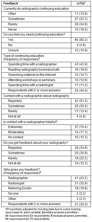 'Spending time with a radiographer' was the most common form of continuing education (44% of total responses; Table 2). Respondents could choose more than one answer to this question so there were 98 responses from 63 respondents. Asked whether they had contact with a local radiographer, approximately half said they 'Regularly' had contact, and a further 30% 'Sometimes' had contact with a radiographer. Approximately 70% said this was 'Extremely' helpful. Approximately two-thirds of respondents received feedback about their radiography either 'Regularly' or 'Sometimes'.