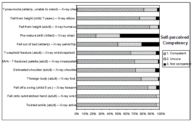 Very few respondents felt that their radiography was of the same standard as that of a radiographer (Table 1), although approximately half thought it was 'Good but not excellent' and another 41% said it was 'Satisfactory most of the time'. Respondents rated their competency in performing 12 different radiographic examinations (Fig1). For only two examination types (ankle and wrist) did more than 90% of the respondents describe themselves as feeling competent. The infant chest X-ray had the lowest proportion of respondents in the competent category (23%, n=18). For 6 other examinations less than 80% of respondents felt competent.