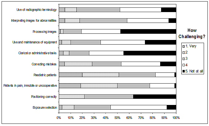 The results for the questions 'How challenging do you find ...?' and 'How well do you understand ...?' (related to a range of knowledge and skill aspects of radiographic practice) are given (Figs2,3). The most challenging were performing examinations on paediatric patients and difficult patients, which generally require higher level radiographic and patient interactional skills11,12. The least challenging were image processing and administrative tasks. The highest self-reported level of understanding was in 'Radiation protection' and the lowest in the more cognitively complex tasks of evaluating radiographs for errors, image quality assessment, and identifying radiographic pathology13-15.