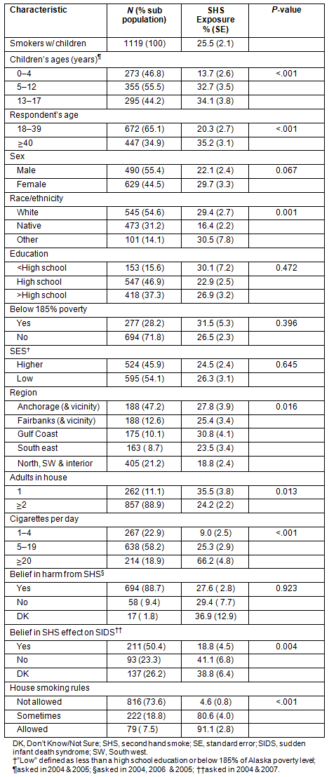 The prevalence of SHS exposure estimated from the 1119 respondents in the combined 2004-2007 Alaska BRFSS data is presented (Table 1). In the population of smokers living in homes with children, approximately 25% reported SHS exposure in their homes in the last month.