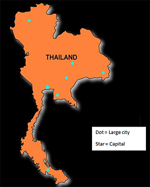 Figure 1: Map of Thailand, which contains 76 provinces and 7 large cities, including the capital. Orange areas are rural, which in Thailand are any area other than the center of provinces and major cities.