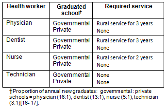 The aims of the rural service as a prerequisite for specialist training and postgraduate scholarship policy were to widen the range of physicians involved in mandatory rural service while stemming the draining of physicians from public to private sectors. At least one year of rural practice is required for all the medical graduates (from public and private schools) to enter specialty training. A report from the rural provincial public health administrators who supervise the mandatory rural service physicians is also a required document for the specialty training selection process36.