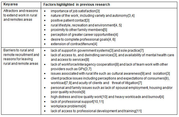 A good deal of the rural and remote workforce literature has focused on the recruitment and retention of the health workforce, in particular doctors. Identified key attractions and barriers to working in rural and remote areas are summarised (Table 1).