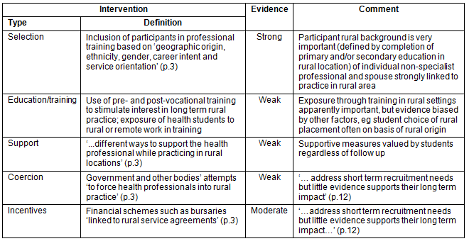 This information, which provides insight into issues of rural and remote workforce recruitment and retention, has been substantially qualified by two recent systematic literature reviews. One of these sought interventions to increase the number of health professions practicing in rural and remote areas12 but found no publications that met the Cochrane selection criteria. The subsequent review by Wilson et al13 used a less exacting inclusion criterion for research studies and the findings are summarised (Table 2), with weak evidence found for: