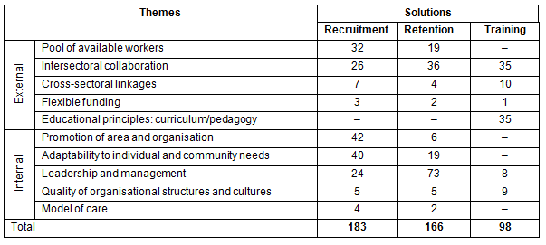 Table 3: External and internal themes according to recruitment, retention and training solutions