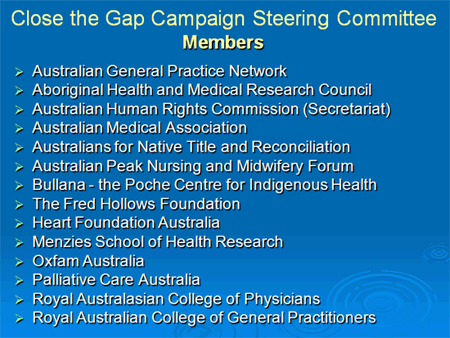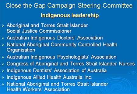 If the name of the Close the Gap Campaign is unfamiliar it is because, like an iceberg, much of the Campaign's activity is beneath the public face. Due to the nature of our work, most lobbying efforts and representation at meetings are necessarily in Canberra or eastern-states focused. And because our efforts involve close work with government, confusion often arises because the Australian Government and the Council of Australian Governments' (COAG) Indigenous initiatives are branded 'Closing the Gap'1. There is a fine distinction here ('Close' vs 'Closing'), and although this is in part testament to the success of the Campaign, from the outset I must distinguish the Close the Gap Campaign's approach from the Australian governments' 'Closing the Gap' efforts. This is more than just a point of definition, for in that fine space of difference lies the answer to my question: 'What is needed to Close the Gap?'