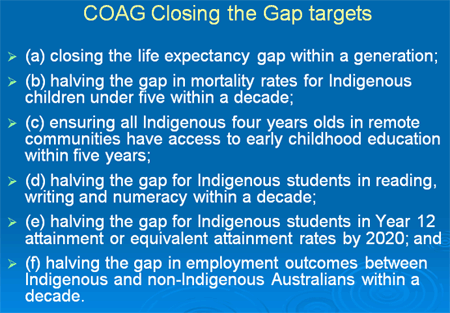 In August 2007, the Federal Opposition under the leadership of Kevin Rudd signalled its support for the Close the Gap approach in its Indigenous affairs election platform. As a result, 'Closing the Gap' entered the policy lexicon. Following the election of the Rudd Labor Government, many aspects of the Close the Gap Campaign became official government policy. Since then, Australian governments through a number of COAG commitments have adopted elements of the Close the Gap approach. In December 2007, COAG adopted a target to 'achieve Aboriginal and Torres Strait Islander life expectancy equality within a generation'1. This was supported by the target to 'halve the mortality rate of under 5 year old Aboriginal and Torres Strait Islander children within 10 years'. By mid-2009, a total of 6 COAG 'Closing The Gap' targets had been announced (Fig8). That was our first great success.
