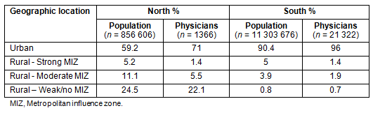 Differences were evident in the distribution physician certification in northern and southern practice locations. In the north, GPs and CFPC-certified FPs accounted for 62.2% of the physician population, compared to 47.5% in the south. It is clear from examining the MIZ categories that RCPSC-certified specialists were heavily concentrated in urban areas (Table 2). In the north, 48% of physicians in urban areas were RCPSC certified specialists, whereas 0%, 4% and 17% of the physicians practicing in strong MIZ, moderate MIZ and weak/no MIZ zones, respectively, were RCPSC certified specialists. A similar pattern was found in southern regions where 54% of the physicians in urban areas, 14% in strong MIZ zones, 12% in moderate MIZ areas and 17% found in weak/no MIZ locations were RCPSC certified specialists.