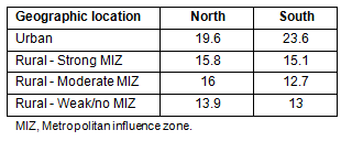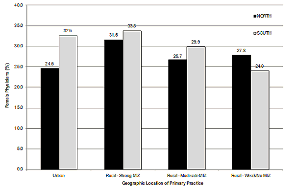 The results indicate that although there are similarities in the distribution of physician demographics in rural and urban areas, there are clear differences between the rural north and the rural south. Likewise, although there are some patterns that distinguish the south from the north, these areas are not homogeneous regions where the urban north is clearly different from the rural north. In considering the implications of these distinctions for the development of physician recruitment and retention initiatives and policies, the importance of accounting for these geographical differences becomes clearer. For example, in relation to the sex distribution of younger physicians, new graduates and undergraduates in medical school, it is clear that future cohorts of physicians entering the workforce will consist of increasingly larger proportions of females23. In general, northern rural areas have attracted more younger male physicians with females and older males found in higher proportions in southern urban and rural areas. If the predominantly female new graduates are to be encouraged to establish their practices in northern and rural regions, it is necessary to be sure that the recruitment and retention initiatives are geared specifically to attract and support this population.