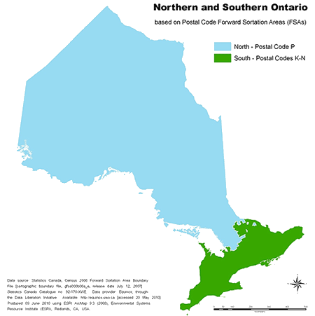 Figure 1: Map of Ontario divided into north and south regions, based on postal code geography.
