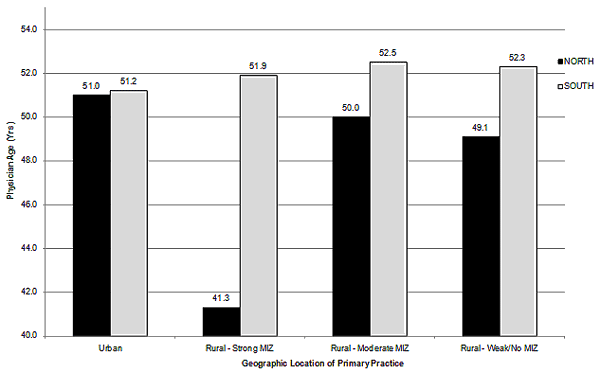 The mean ages of northern and southern physicians were 50.4 and 51.2 years, respectively. However, the age differences per MIZ category provide distinct age patterns across both northern and southern and rural and urban areas (Fig2). In northern locations, physicians tended to be younger in rural locations. The mean ages of northern physicians were: 51 years in the urban north, 41.3 years for north strong MIZ, 50 years for north moderate MIZ, and 49.1 years for north weak/no MIZ. For southern physicians, mean age steadily increased with increasing rurality. In the south, urban physicians had a mean age of 51.2 years, strong MIZ physicians were 51.9 years, moderate MIZ were 52.5 years and weak/no MIZ physicians were 52.3 years. The age distribution (histograms) of the physicians in each MIZ category were examined and no abnormalities found because each category was normally distributed.