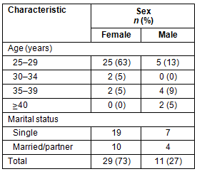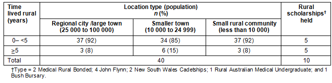 There were 40 survey responses from 88 students, representing 45% of the Year 4 cohort. Most respondents were female (73%), aged 25-29 years (75%) and single (65%) (Table 1). Most respondents (70%) had lived in a metropolitan area for more than 15 years, and up to 15% of respondents had either lived in a regional city, smaller town or small rural community (as defined by the Australian Rural and Remote and Metropolitan Classification [RRMA]) for more than 5 years (Table 2). Respondents held a total of 10 rural scholarships, evenly distributed between students from rural and non-rural backgrounds; 4 respondents (10%) held bonded medical places.