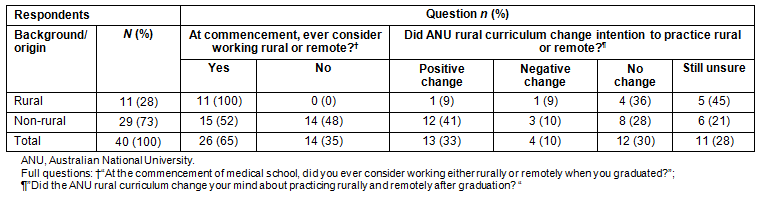 There were 6 applications for rural internship among the 40 respondents (15%) and, of these, three had not considered working in a rural or remote area at the commencement of medical school. From this group, two students participated in the year-long placement program. Five of the 6 applicants stated that the ANU rural curriculum changed their intention rural practice, while one applicant always had a rural career intention.