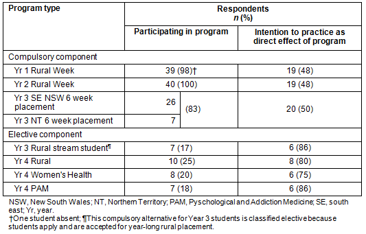 Direct effects of rural programs: The compulsory components (Years 1 and 2 rural weeks, Year 3 six-week placements) had between 83% and 100% respondent participation (Table 4). From those participating in these programs, 50% indicated they were likely to practice in a rural and remote area as a result of their ANU rural training experience. The proportion of respondents undertaking rural programs on an elective basis ranged from 17% to 25%. Students interested in rural and remote health tended to select these programs, with 75% to 86% of respondents indicating their intention to practice as a direct result of undertaking an elective program.