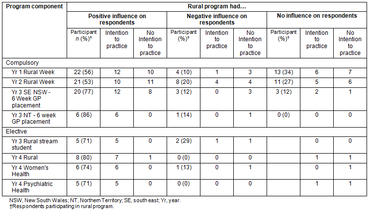 Influence of rural programs on intention to practice: Students were asked whether the rural programs had a positive, negative or neutral influence on their rural intention (Table 5). As a result, 56%, 53% and 77% of students reported the positive influence of Years 1 and 2 rural weeks, and Year 3 placements, but only half had a rural practice intention. In comparison, almost all students who chose a Year 3 year-long placement, 6 week NT placement or a Year 4 elective component reported a positive influence on their intention to practice in a rural and remote area. For both compulsory and elective components, students with negative experiences had no rural practice intention, while for students with neutral experiences, the intentions were evenly divided.