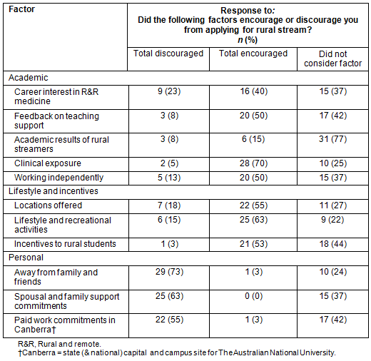 Factors affecting the decision for year-long rural placement (rural stream): Respondents rated factors that encouraged or discouraged their application for a rural stream. The results are presented according to categories of academic, lifestyle/ incentives and personal factors (Table 6). For respondents who considered the factors encouraging, clinical exposure was the most encouraging, followed by rural incentives and feedback on teaching support in deciding whether to apply for rural stream. The personal factors of spending time away from family and friends, work commitments in Canberra and spousal/family support strongly discouraged some respondents from applying for a rural stream. Respondents felt more strongly about discouraging factors associated with personal circumstances than the encouraging factors of academic and lifestyle/incentives when deciding whether to apply for the Year 3 rural stream. Almost 50% of respondents did not consider incentives to rural students, paid work commitments in Canberra and teaching support for rural stream students when deciding to apply for a rural stream.