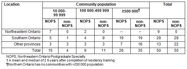 Table 1: Northeastern Ontario Postgraduate Specialty (NOPS) and non-NOPS participants according to location at 31 December 2006? and population size of community
