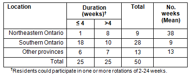 Most northeastern rotations were completed during the third (28%) or fourth (34%) residency year. Twenty percent of NOPS participants did more than one northeastern rotation. Fifty percent of the residents had a total northeastern rotation of 4 weeks or less, 30% had 6-12 weeks and 20% had 20-104 weeks. Overall, there was a mean of 15 (median=5) weeks per resident. Most participants did their rotations in the major northeastern Ontario cities of Sudbury (42%), North Bay (38%) or Sault Ste Marie (16%).