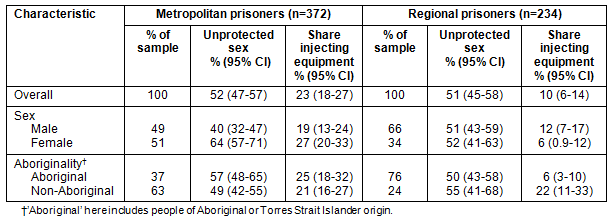 The findings demonstrate considerable variation in risk behaviours among sociodemographic subgroups. High rates of reported risk behaviour among females correspond with high rates of BBVs among females1,11,13, which have been reported elsewhere11,13-15. Our finding of a higher prevalence of reported unsafe injecting practices among individuals admitted to metropolitan prisons when compared with individuals admitted to regional prisons is consistent with reported geographical differences in hepatitis C rates among Aboriginal prisoners11,15,16. Furthermore, Aboriginal prisoners in regional prisons were significantly less likely to report unsafe injecting practices than non-Aboriginal prisoners.