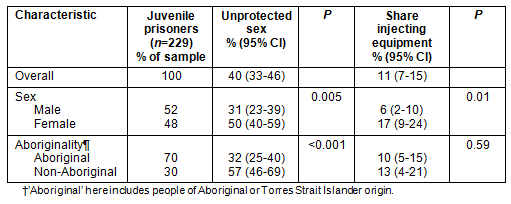 Reported behaviour among juveniles also differed significantly by sex and Aboriginality (Table 2). Juvenile females were significantly more likely to report unprotected sex and sharing injecting equipment than juvenile males, and juvenile non-Aboriginal prisoners were significantly more likely to report unprotected sex than juvenile Aboriginal prisoners.
