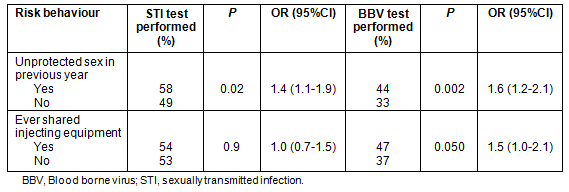 Table 3: Association between reported risk behaviours for sexually transmitted infections (STI) and blood borne viruses (BBV) and the performance of BBV and STI testing