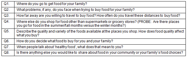 Each focus group included 8 structured questions aimed at generating meaningful dialogue about food access (Table 1). These questions were developed and refined by a team of approximately eight researchers with expertise in nutrition, childhood obesity and public health.