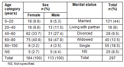 Demographic profile of the clients: Of the 295 respondents who revealed their sex, the majority were female accounting for 62% of the respondents. As well, the majority of clients (over 78%) were at least 40 years old with a mean age of approximately 55 years. Such a high proportion of older clients is, to an extent, a reflection of our ageing society; however, it is more likely to be due to a greater prevalence of health problems among older people (Table 1).