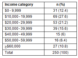 To establish income status, users were placed into 7 household income categories, with the lowest income category being $10,000 or less, and the highest $60,000 or more. A number of users (n=47) did not indicate their income category, but the income category of those who did was distributed as is shown (Table 3).