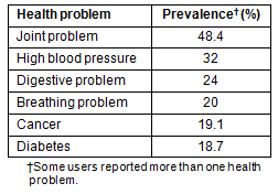 Users' reported health problems and their prevalence are shown (Table 4). It is notable that approximately half the clients with health problems suffer from joint problems, which would make driving difficult, hence their use of the Connections service. The prevalence of various health problems among users presumably reflects the absence of or inadequate appropriate healthcare services in their local communities.