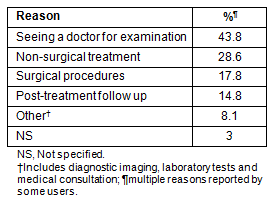 Medical reasons for travel: Users indicated a wide range of medical reasons for their travel. Such reasons have been broadly classified as: (i) seeing a doctor for examination; (ii) non-surgical treatments; (iii) surgical procedures; and (iv) post-treatment follow up (Table 5).