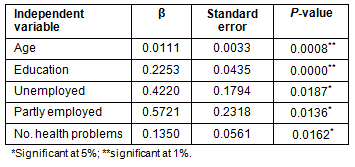 The set of explanatory variables includes sex (a binary variable), age (measured in years), education (measured as an ordered categorical variable with 1=lowest level of education and 6=highest), income (also measured as an ordered categorical variable with lowest income category=1 and highest=7), 5 dummy variables for the employment status of users (retired, disabled, student, unemployed, and part-time employed) with the full-time employed users taken as the reference category, and the 2 health status variables self-rated health (an ordered categorical variable with poor health=1; excellent health=4) and the number of health problems (from 1 to 6) (Table 6).