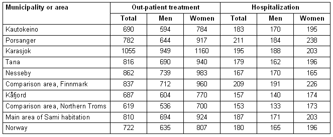 The yearly expenditure rates for both out-patient treatment and hospitalization measured at municipality level vary from year to year. In 3 of the 6 municipalities in the main area of Sami habitation, out-patient treatment expenditure ranged from above to below the national average during the period 2002-2006. The annual variation is largest in the smallest municipality, where the range (highest-lowest yearly rate) is 17 % of the mean annual rate. The annual rates of hospitalization varied even more (up to 33% of the mean annual rate). Taking yearly variation into consideration, the results are presented using mean annual rates for the 5 year period.