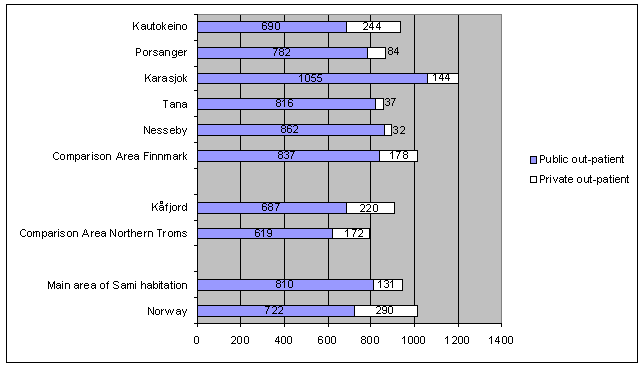 Travelling time to care: It is widely acknowledged that medical care is easier to access when it is located nearby. Therefore 'travelling time to care' as a proxy for access to care is often considered an important factor when explaining differences in healthcare expenditure. None of the Sami municipalities had access to a hospital within 1 hour of travelling time; however, Karasjok is one of 2 municipalities in Finnmark that hosts an out-patient clinic. The location of this clinic might explain the very high out-patient expenditure in Karasjok. Kautokeino is the Sami municipality located furthest from a hospital (>2.5 hours) and this may explain its lower expenditure on public out-patient services. However the use of specialists in private practice in Kautokeino was equal to the national level. While specialists in private practice are located mainly in the urban areas of Norway, there are some specialists located within 2 hours' travel of Kautokeino.