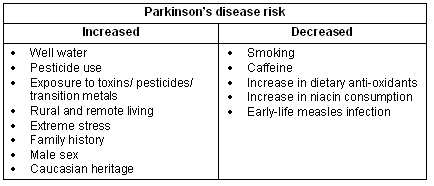 Parknison's disease has a strong genetic link, yet other risks including environmental factors such as exposure to heavy metals and pesticides are suggested to influence the onset7. Both European3 and Australian5 meta-analyses concluded that rural living is a statistically significant risk factor. Factors linking PD with rurality include the use of pesticides, herbicides and transition metal exposure (in agricultural and mining practices)3,7 where neurotoxity theories are espoused. Stress and the use of bore (groundwater) and well water are also noted in rural areas. Whether rural living itself increases exposure to other unknown neurotoxins or whether urban living is protective is yet to be established. Paradoxically, smoking and caffeine ingestion have exhibited protective characteristics for PD3,7-9. A risk factor summary is provided (Table 1).