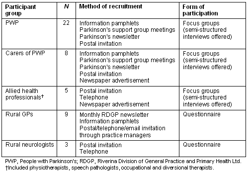Ethics approval allowed access to the database of the Wagga Wagga Parkinson Support Group (WWPSG) after written approval from the President, and the researchers were able to send personal letters of invitation with the pamphlets. Preliminary talks were also given to three meetings of the WWPSG. The WWPSG also distributed pamphlets to their members at meetings and via mailed newsletters.
