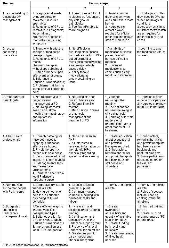 Four focus groups of PWP were conducted. It was also the researchers' perception that the PWP and carers' focus groups often served to enhance education for participants as they learnt from others' experiences. The theme areas from the PWP group are discussed and summarised (Table 3), with questions asked about diagnosis and medication, frequency of medical visits, the roles of GPs and neurologists, interaction with AHP and available supports.