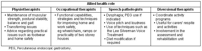 Role of allied health professionals: The AHPs most frequently visited were physical, speech and occupational therapists, with chiropractors and remedial therapists also utilized for 'sore backs' and 'stiff necks'. While physiotherapists were consulted for a wide range of motor disturbances, dysphagia was the most common reason for visiting speech pathologists. Occupational therapists, often working in conjunction with physiotherapists, dealt with the impact of PD motor disturbances at home and work. Considerable variability in the knowledge of AHPs and their roles in treatment was noted in the PWP focus groups.