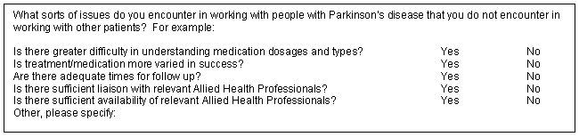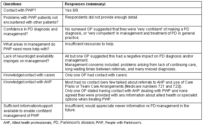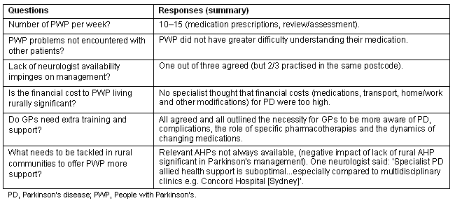 All three full-time neurologists based in the GSAHS region replied to the questionnaire regarding the delivery of health care to PWP. All stated they saw 11-15 PWP per week, mainly for pharmacological prescription, review and assessment. Referrals for various forms of therapy, especially speech and physical modalities, was the second most often reported specialist activity with PD patients. The neurologists scored the 5 closed questions in Item 4 of the questionnaire similarly (Table 6).