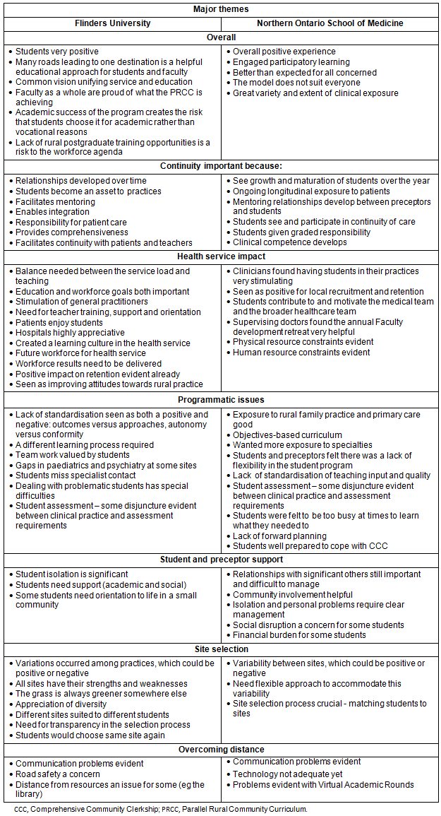 The major common themes between the schools were the strongly positive feelings about the program from virtually all people interviewed, and the expressed educational value of the program in terms of continuity of care, longitudinal exposure, development of relationships, mentoring, team work, and participatory learning. The workforce issue - recruitment and retention - is also significant. Common concerns relate to issues of standardisation, ensuring exposure to all specialist disciplines, communication, support for students and preceptors, isolation, dealing with personal issues, and the process of site selection.