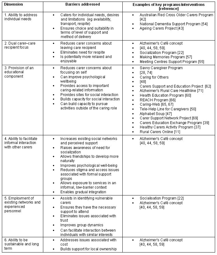 Table 1: Key dimensions of effective programs designed to address social isolation among rural and older carers11,22,28,37,39,40,42-44,47,48,50,54,55,57-60,62,65-67,69,71,74