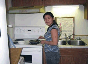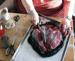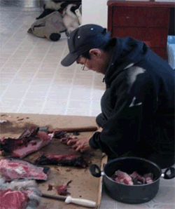 Figure 1: An elder preparing country food brought by her family. They come by regularly with country food and there is a hunter in this family.