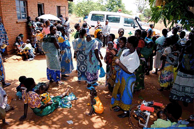 The two mobile clinics were deployed on 13 October 2008. On the first day of operation, both were overwhelmed with patients, with the 100 patients at each site more than double the anticipated number. Because of the overwhelming number of patients, the vehicle drivers assisted staff to deploy a crowd control strategy to maintain a calm and orderly environment (Fig1). To ensure the sickest patients were seen first, staff prioritized patient 'health passports' (the patient-held ongoing medical record used in Malawi), identifying the patients who required priority. In a community participation strategy, GAIA encouraged village health committee members to take on triage and other duties, for which they trained.