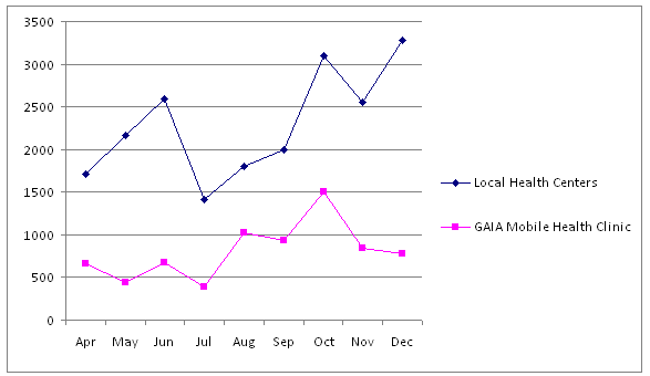 To assess the impact of the mobile clinics on the catchment areas, collected data were examined on visits from children under 5 years with clinical malaria at both the GAIA mobile clinics in the period April to December 2009. This data point was well-matched with HMIS data collected from health centers designated to served these same catchment areas and reflects the sixth UN millennium development goal (to combat malaria and other diseases). The number of children seen by the health centers and by the GAIA mobile clinics show similar trends, including seasonal impacts; however, the number of children seen by health centers did not decrease after deployment of mobile clinics (Fig4). It may be that the GAIA mobile clinics are providing care to children in remote areas who would otherwise not receive care. The mobile clinics closed for staff leave for 2 weeks in December of 2009, and this is reflected in a drop in the number of children seen for malaria. In the same month, the number of children seen at the health centers increased, and it may be that parents who had been educated about the dangers of malaria sought assistance at the health centers when the mobile clinics were closed.