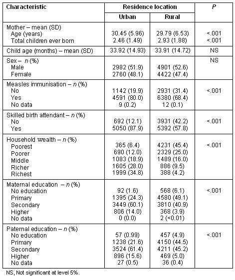 The sample contained 15 065 living children aged 9-59 months. The socio-demographic characteristics of the sample are presented according to location of residence (Table 1). A greater proportion of the sample resided in rural areas (61.9%). Overall, 72.8% of children in the sample had received measles vaccination. The mean age of children was 33.9 months in urban and rural areas, and the number of males and females was similar.