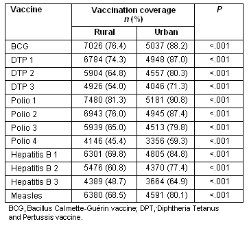 Table 2: Vaccination coverage among rural and urban children for 12 vaccinations listed on the Indonesian vaccination schedule