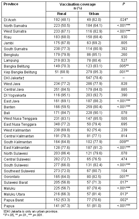 Table 3: Measles vaccination coverage among rural and urban children in each of the 33 Indonesian provinces